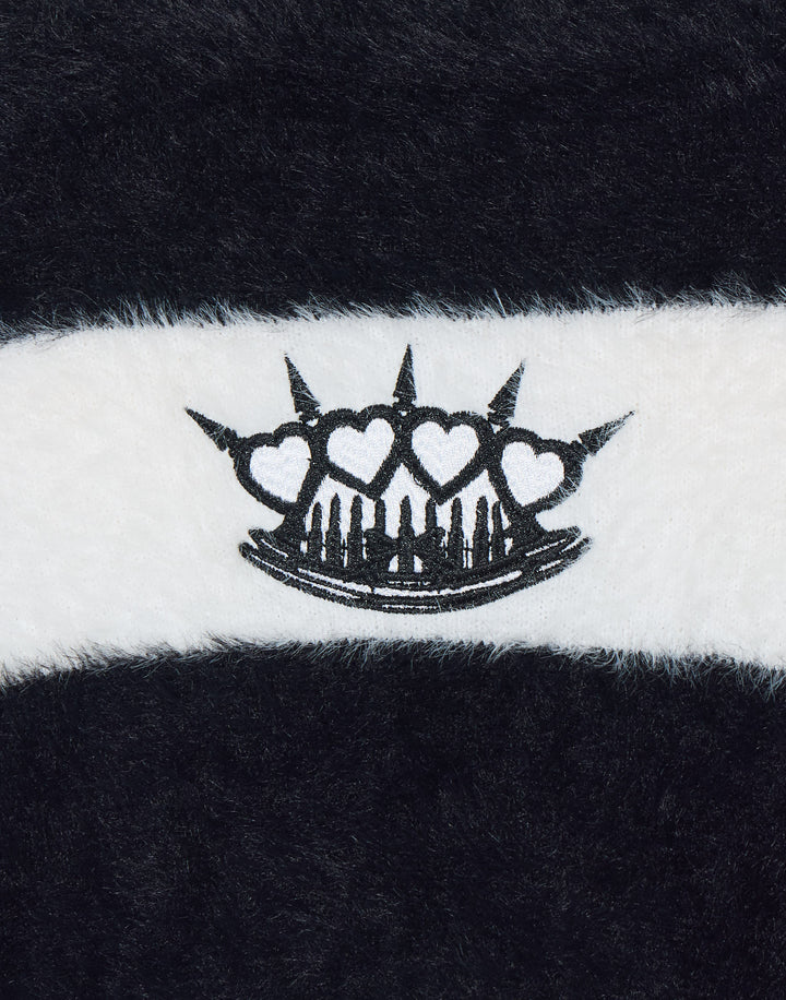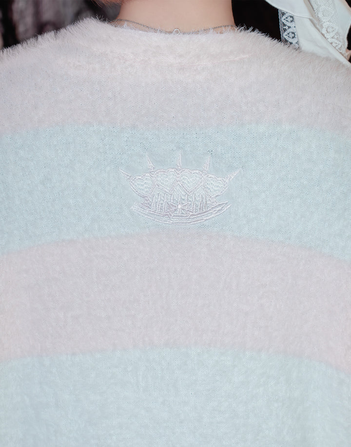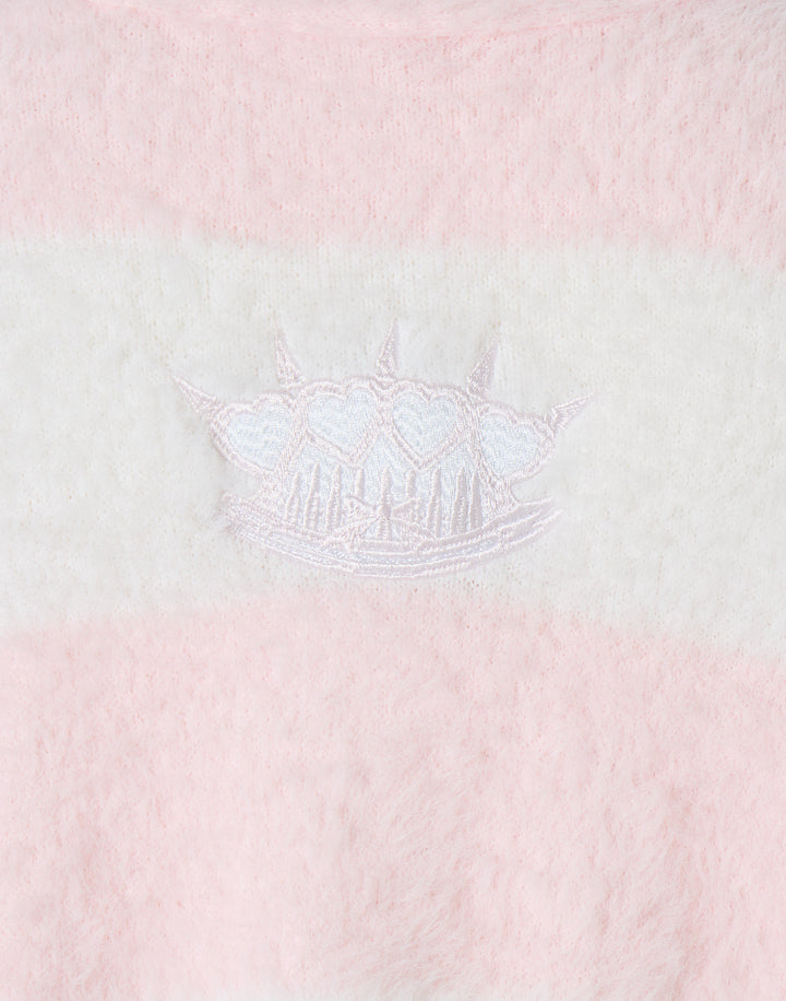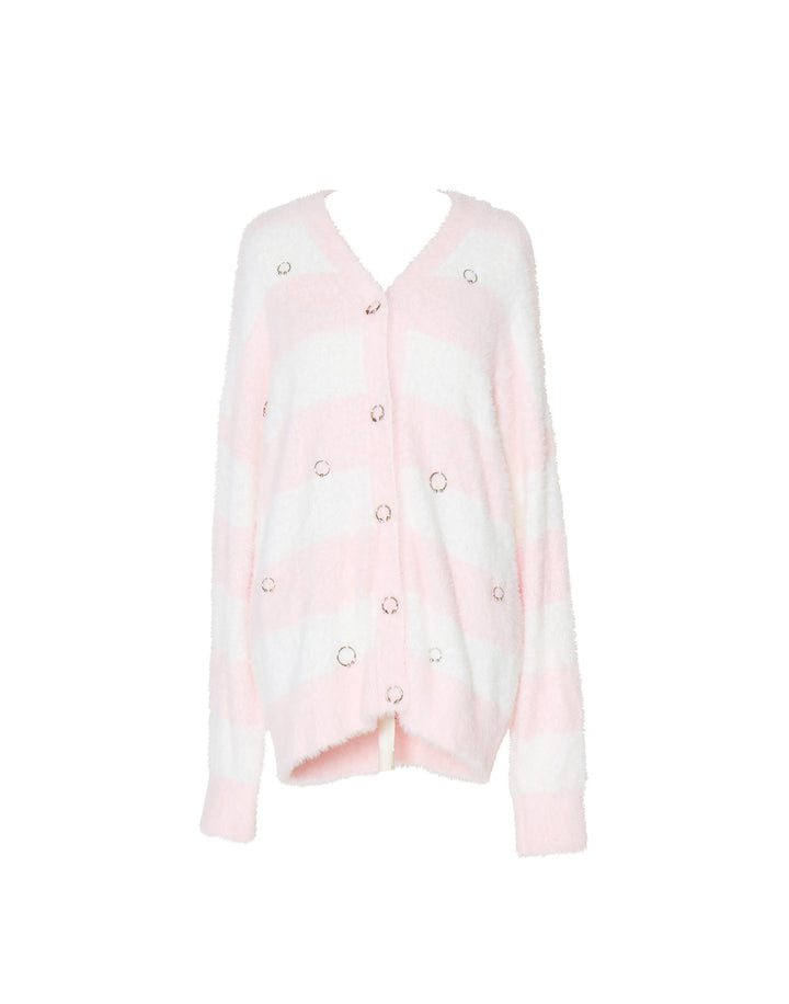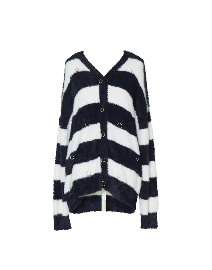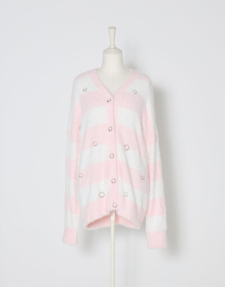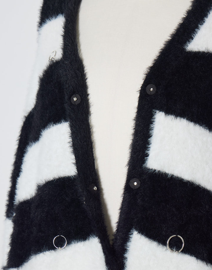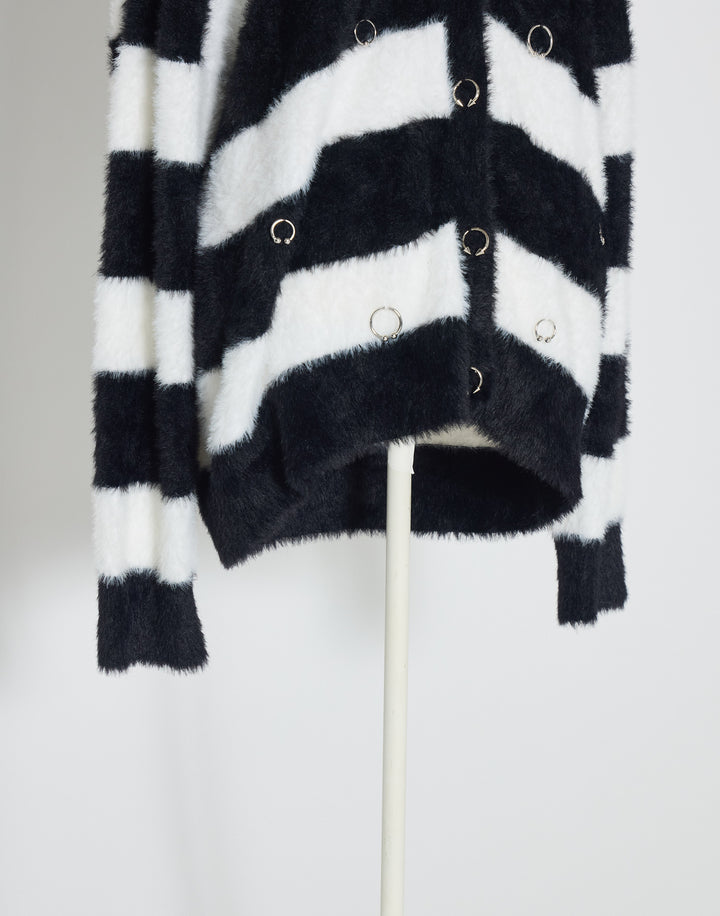 温かみのあるシャギー素材のカーディガン。フロントにちりばめた様々な種類のピアスと首の後ろ側にあしらわれたナックルの刺繍がポイント。