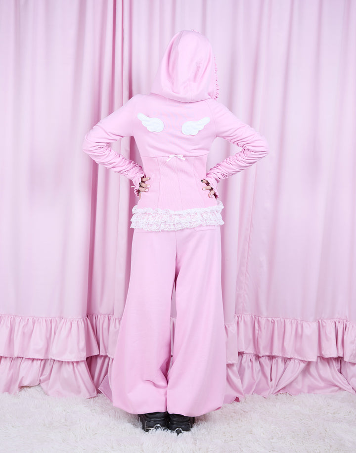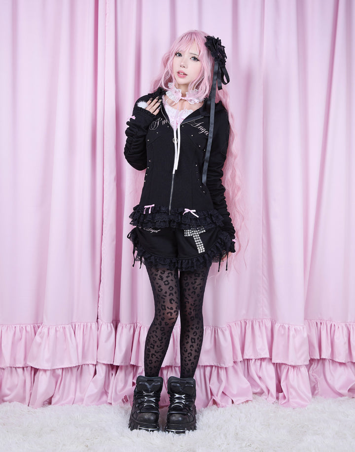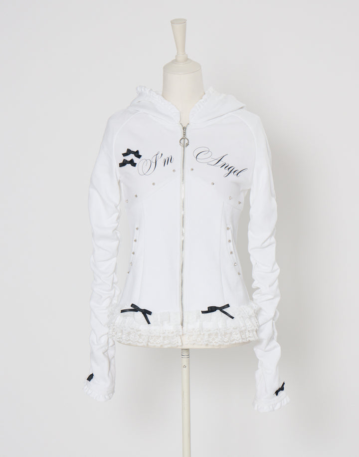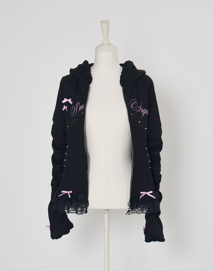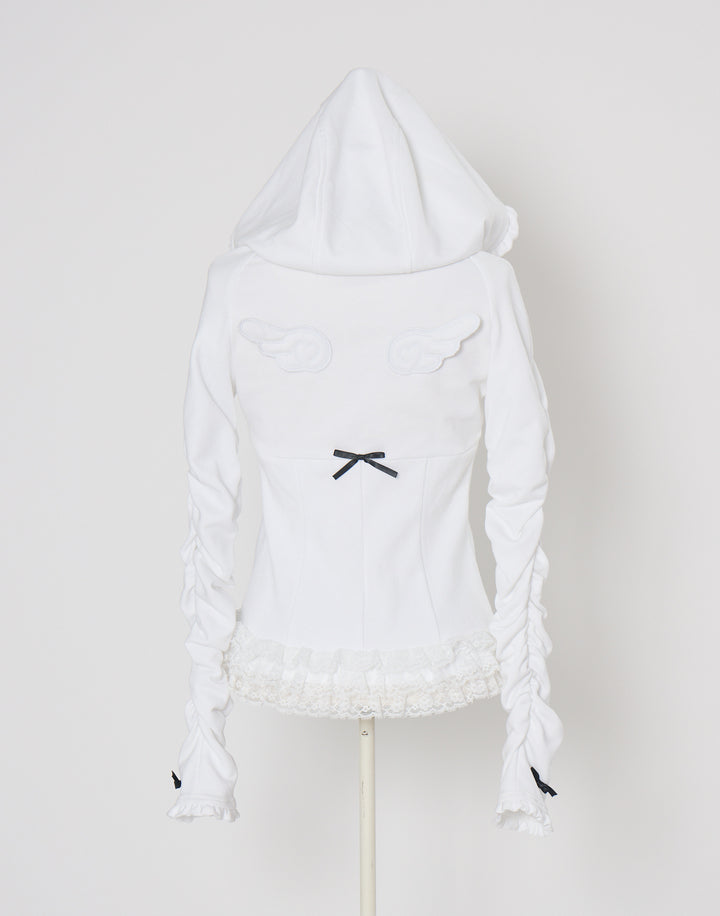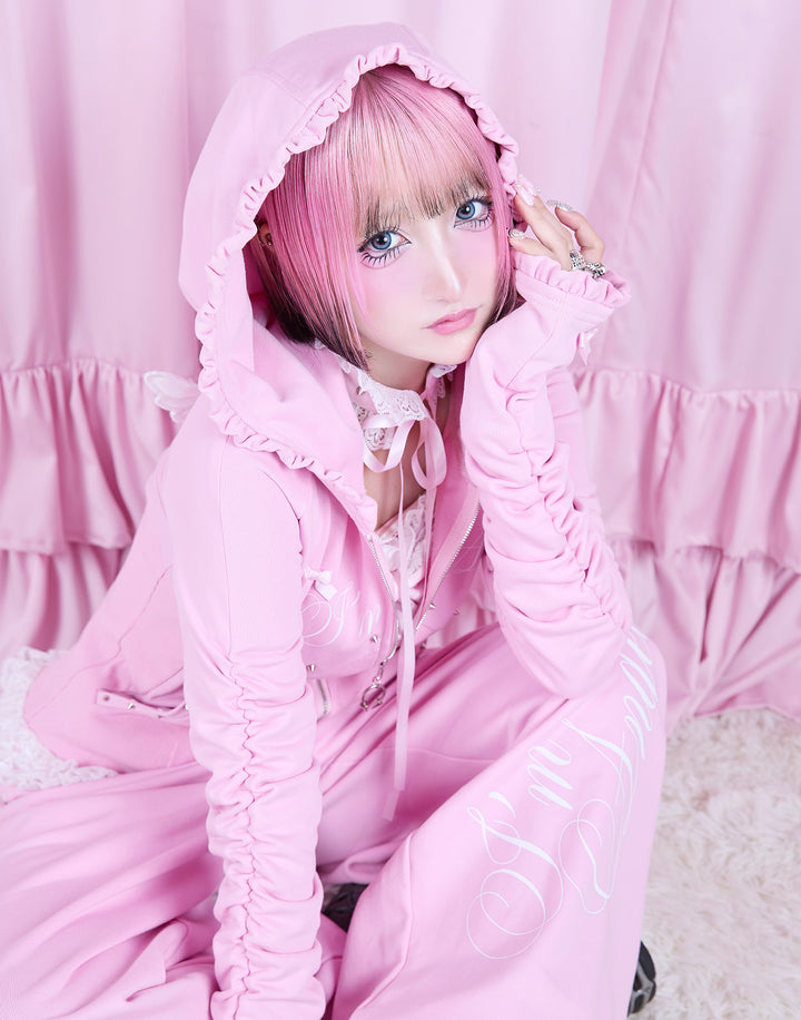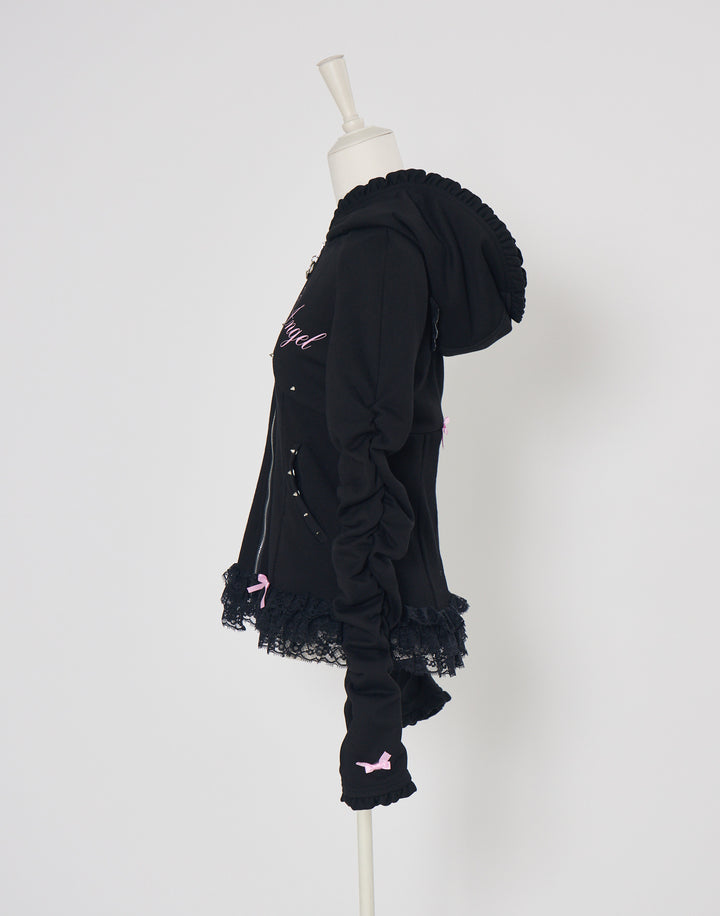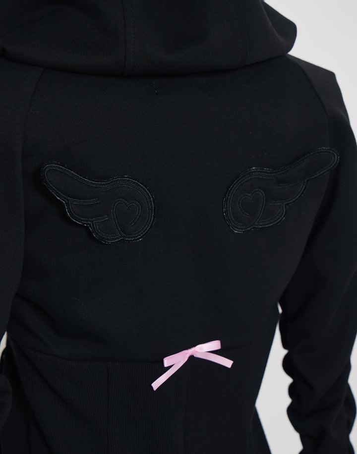 リブ素材でコルセットライクなウエストと背中のオリジナルの羽根がこだわりのフーディー。ジップにはピアス、袖口はリボンと指穴付きのデザイン。