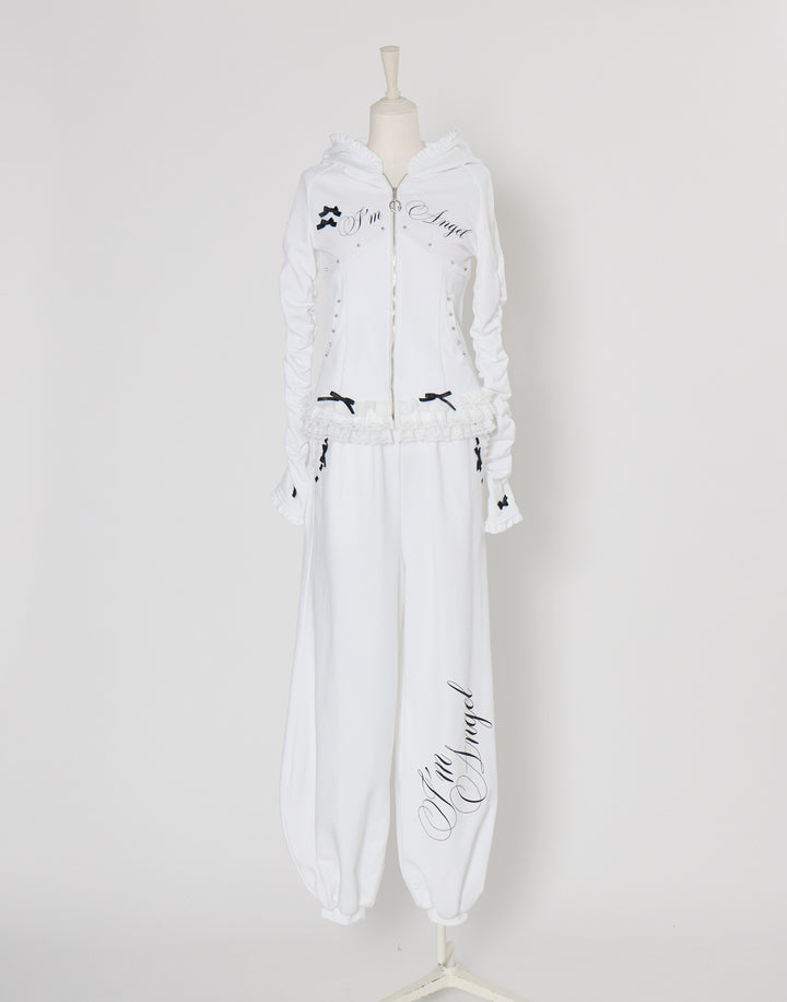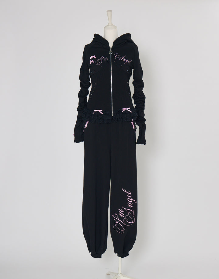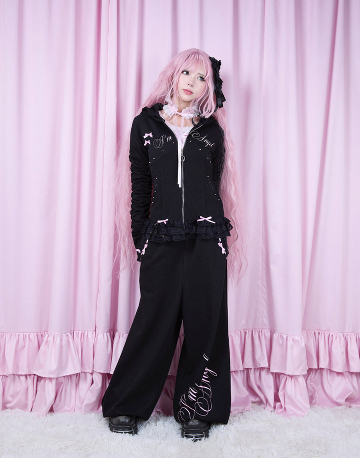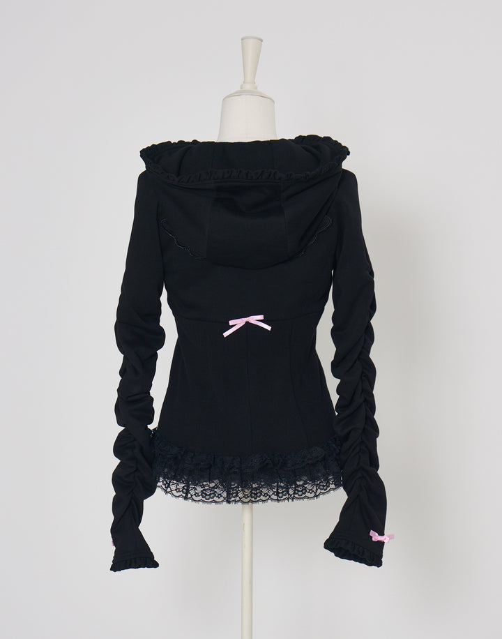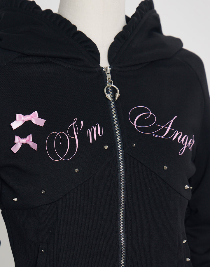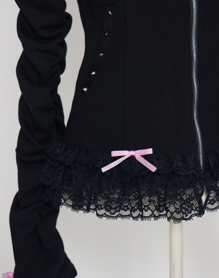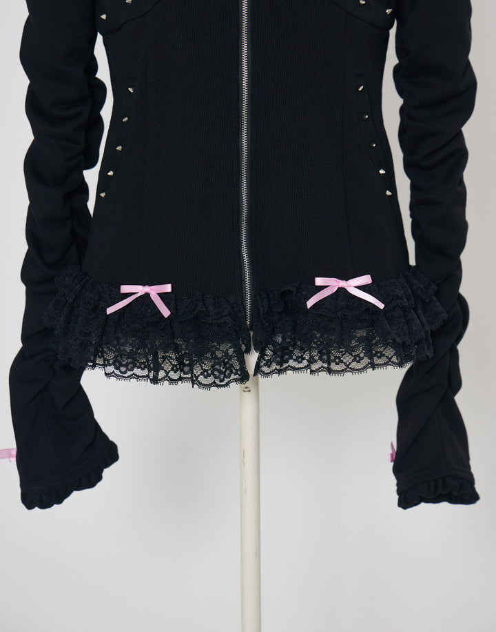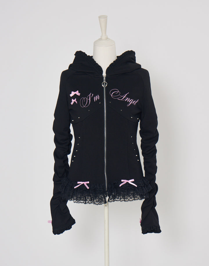 リブ素材でコルセットライクなウエストと背中のオリジナルの羽根がこだわりのフーディー。ジップにはピアス、袖口はリボンと指穴付きのデザイン。