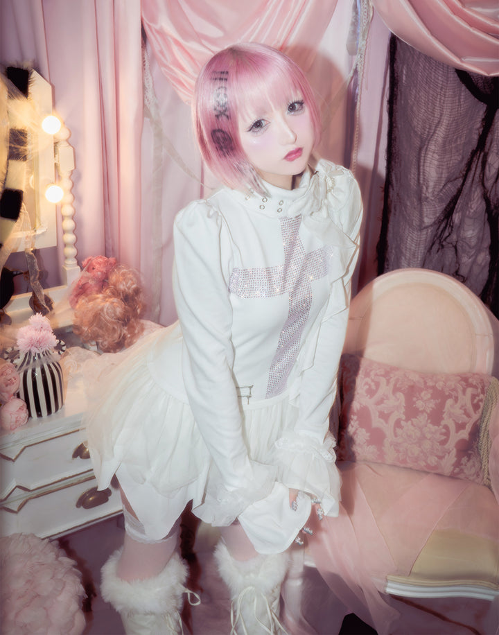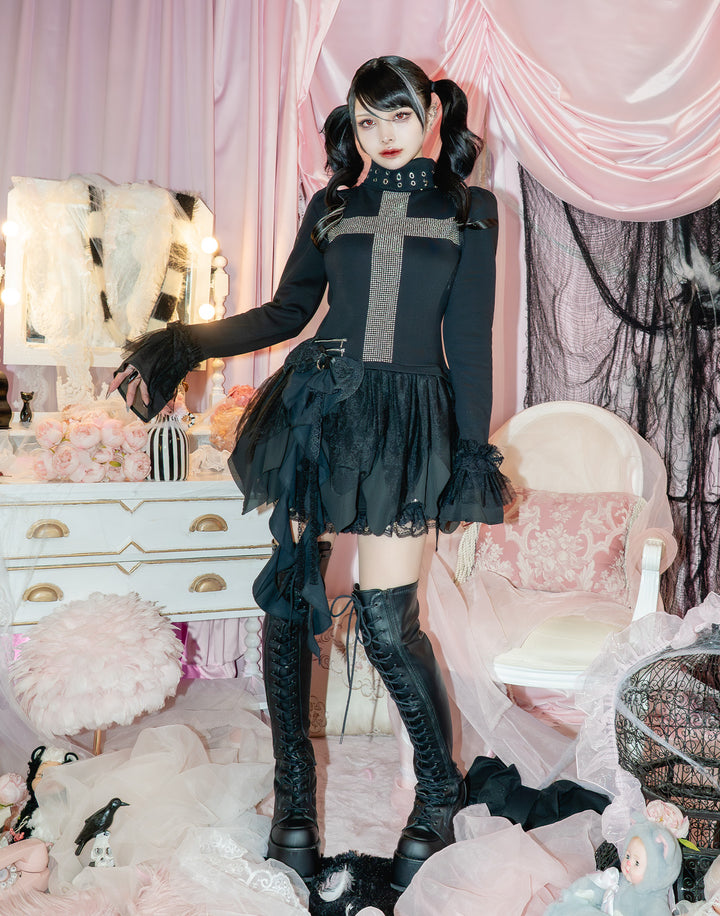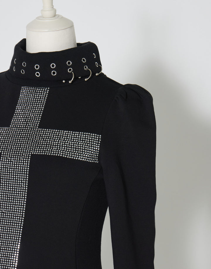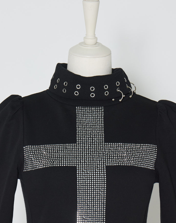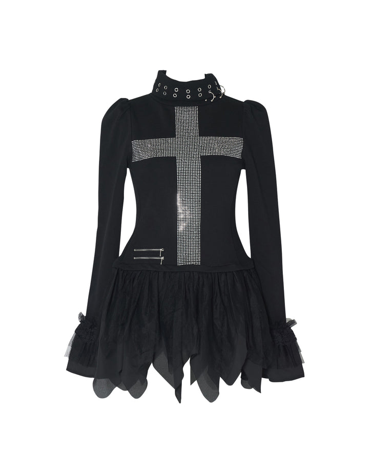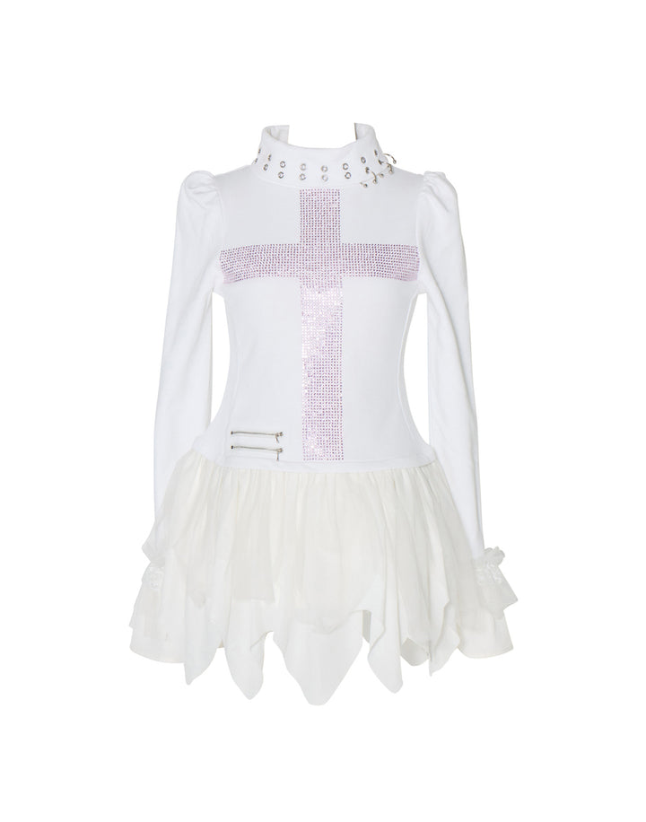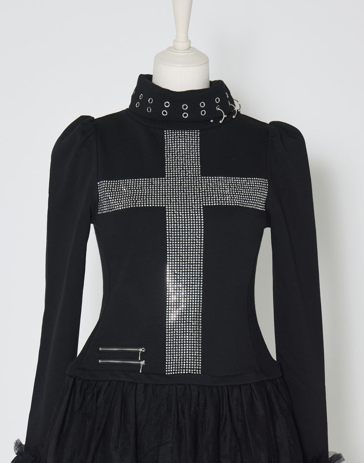 フロントの大きなラインストーンのクロスがきらびやかなミニワンピース。