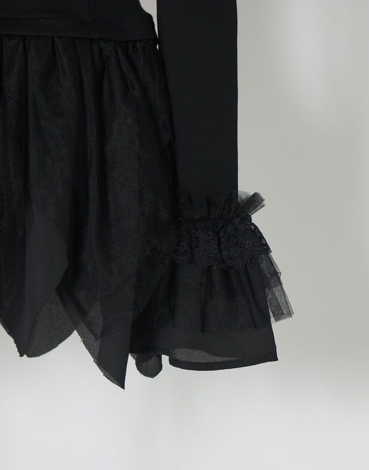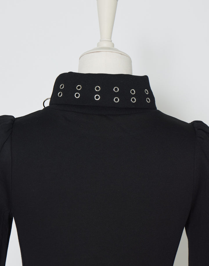 襟元のピアスがスパイシーな印象に。ランダムなシフォン裾でフィット&フレアなシルエットに仕上げてくれます。