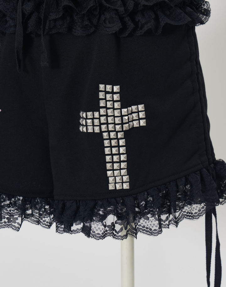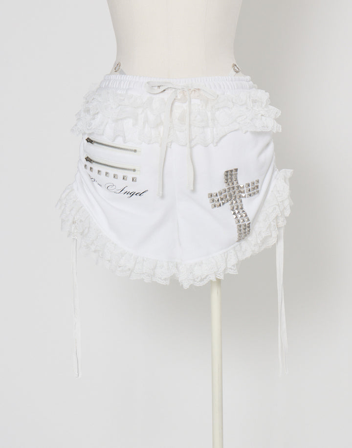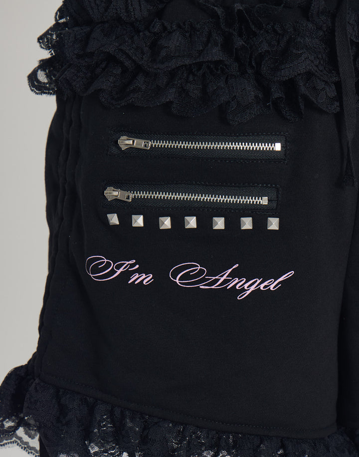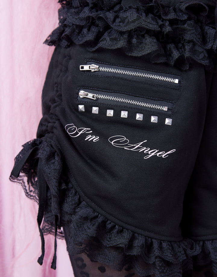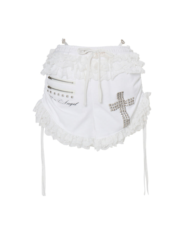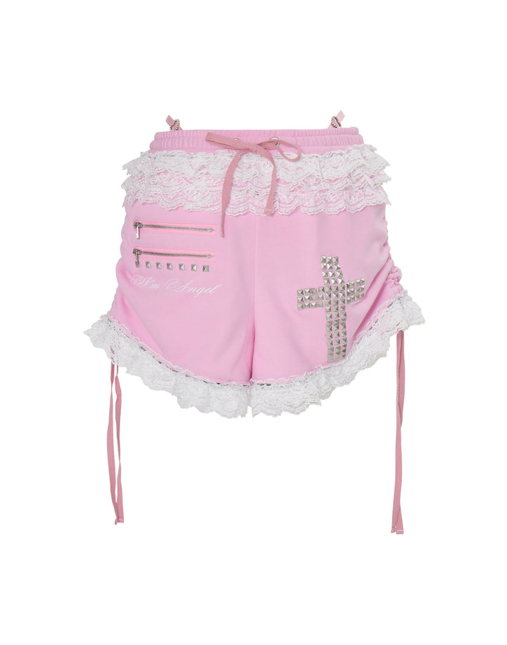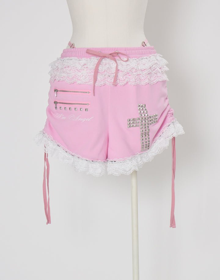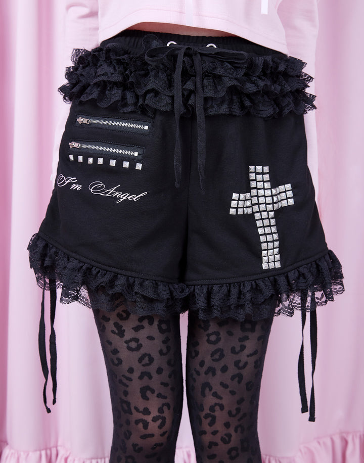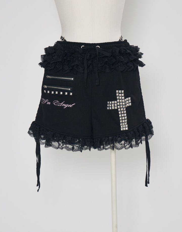 スタッズで作った大きなクロスとたっぷりのレースが目を惹くスウェット生地のショートパンツ。サイドのドロストを絞ってお好きな長さに調節できます。I'm Angel frill zip foodie(32554516)とセットアップでの着用が可能です。