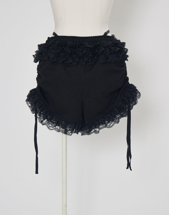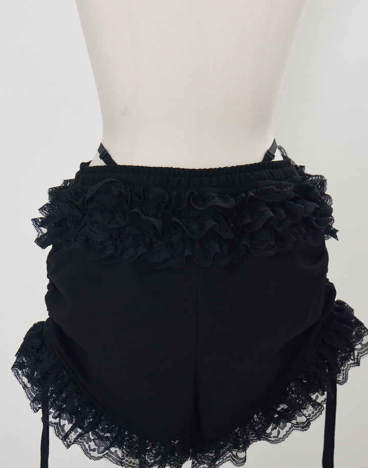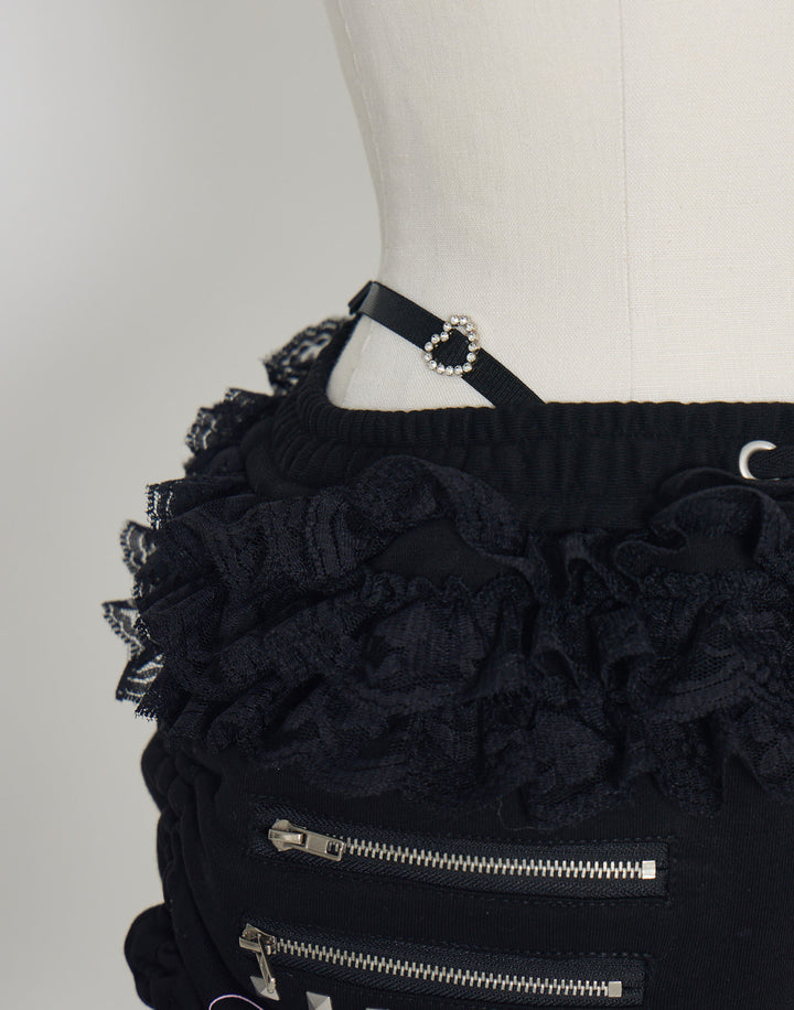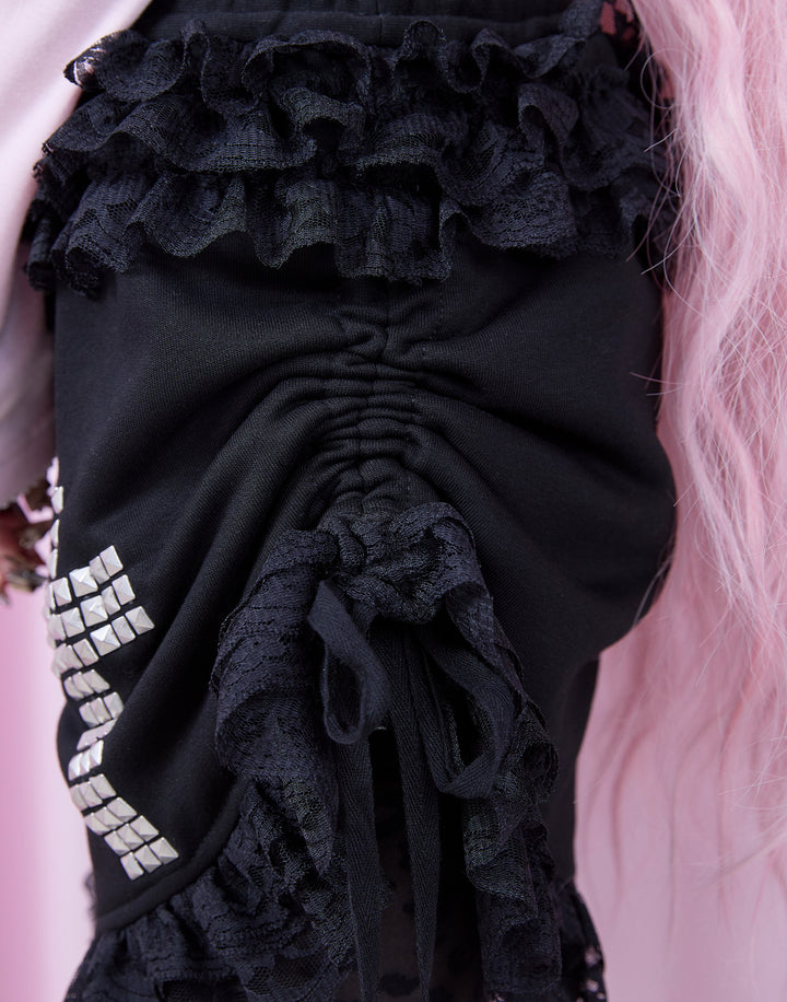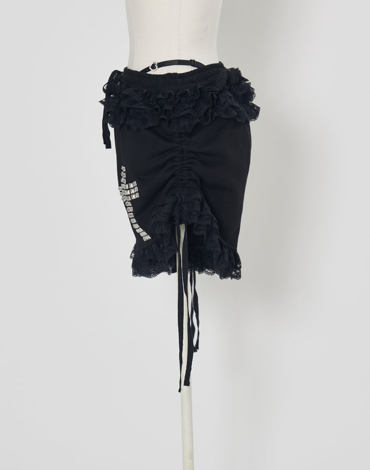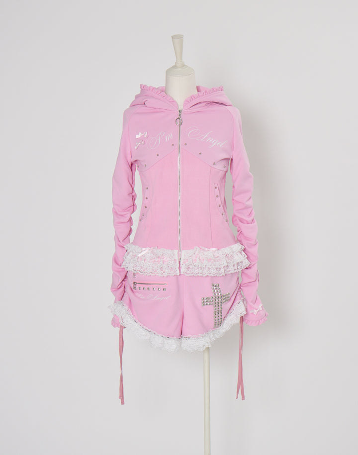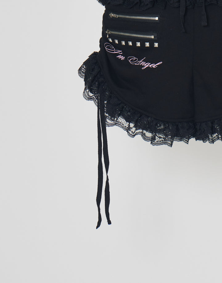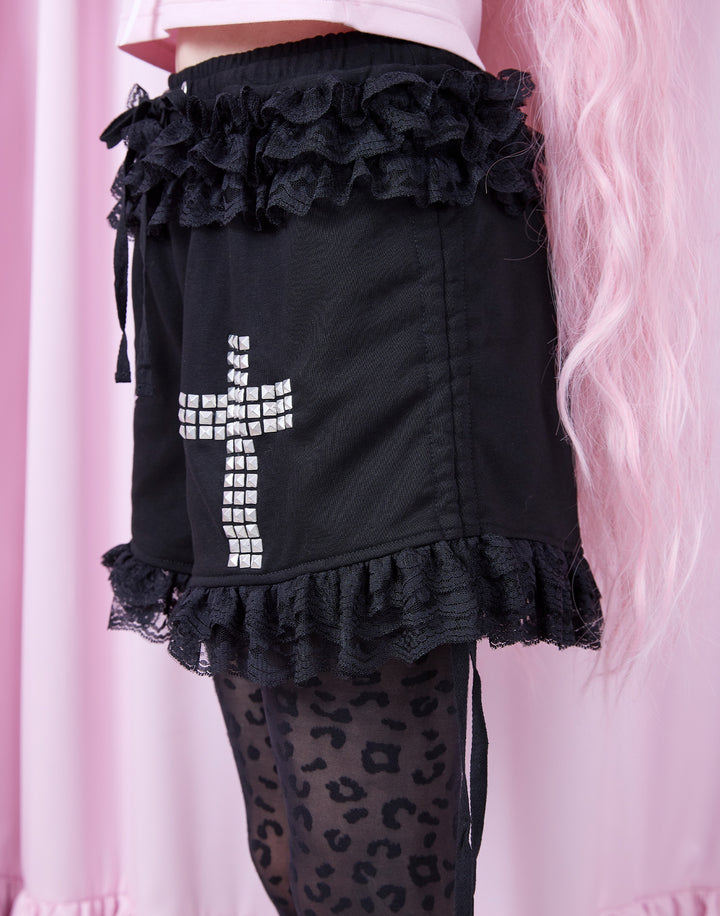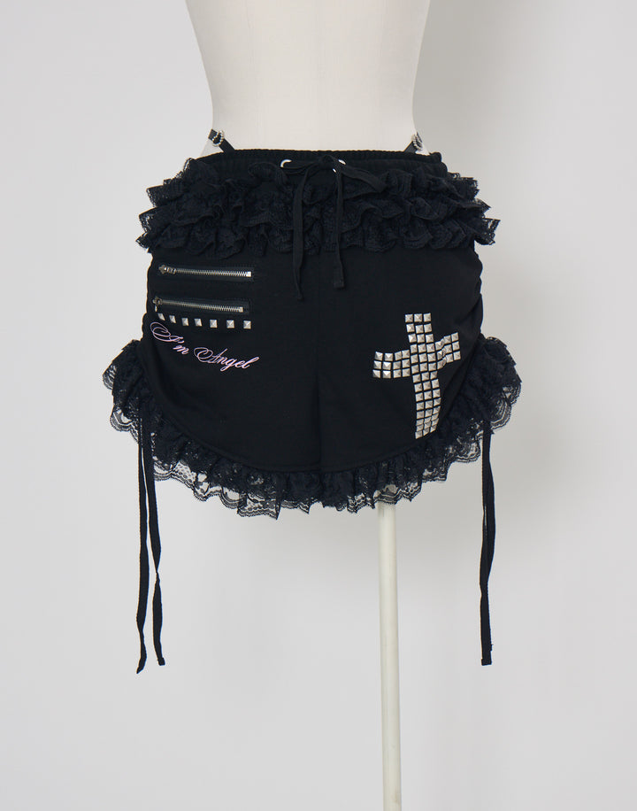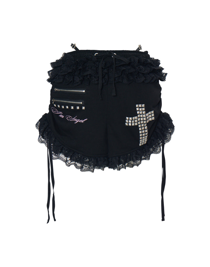 スタッズで作った大きなクロスとたっぷりのレースが目を惹くスウェット生地のショートパンツ。サイドのドロストを絞ってお好きな長さに調節できます。I'm Angel frill zip foodie(32554516)とセットアップでの着用が可能です。