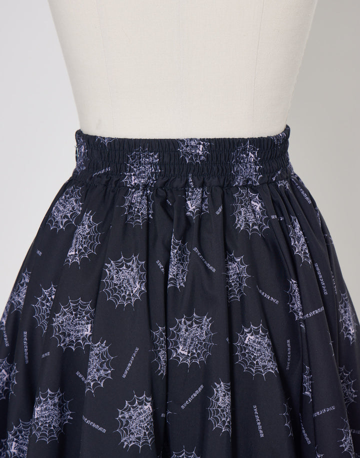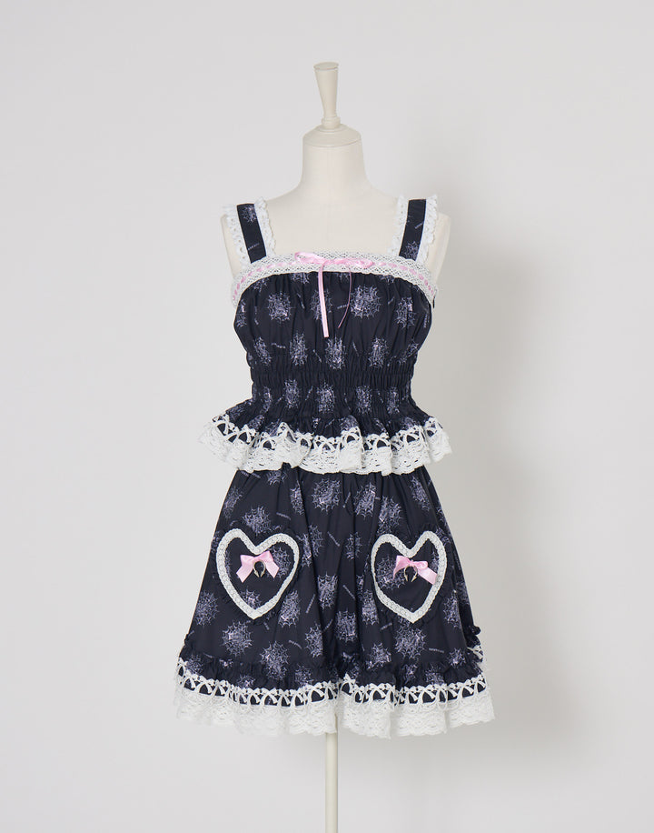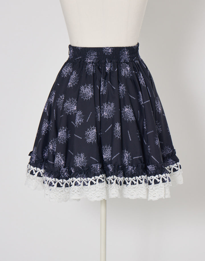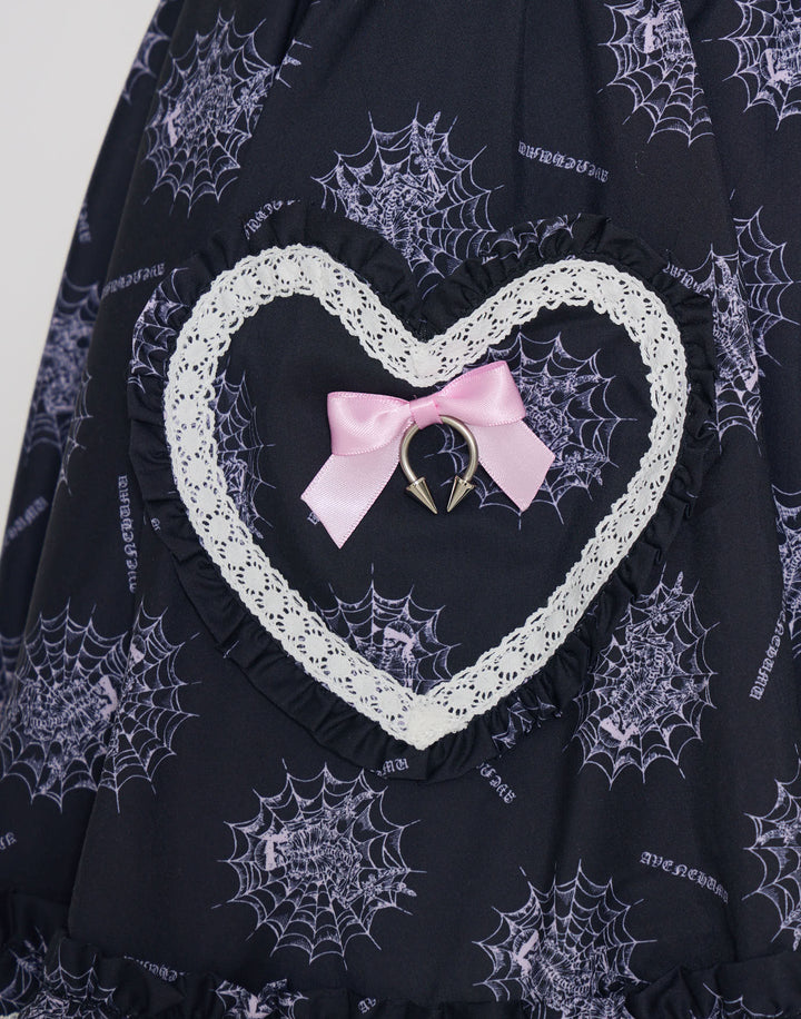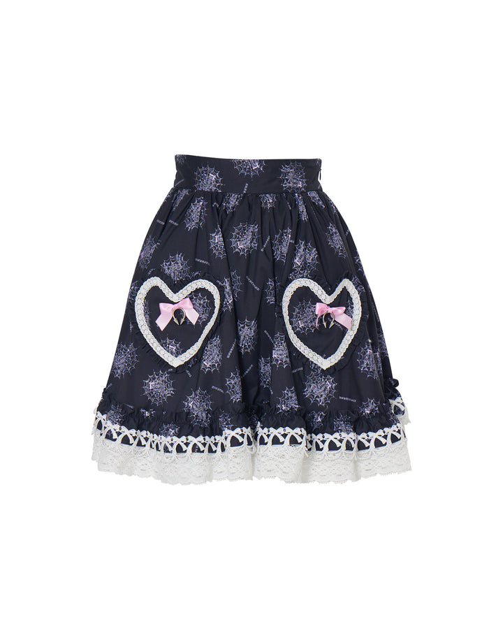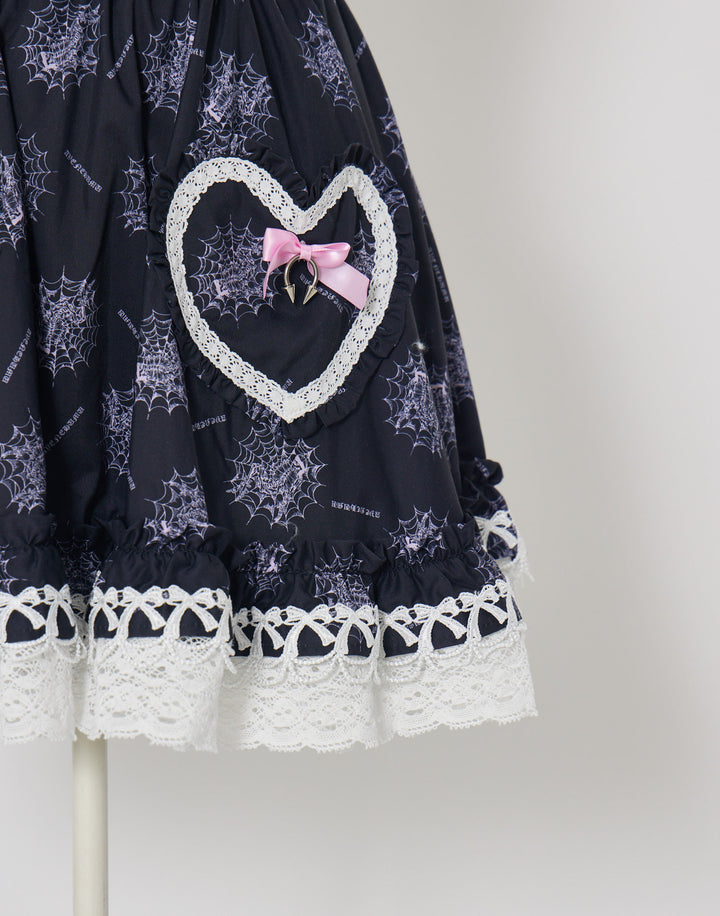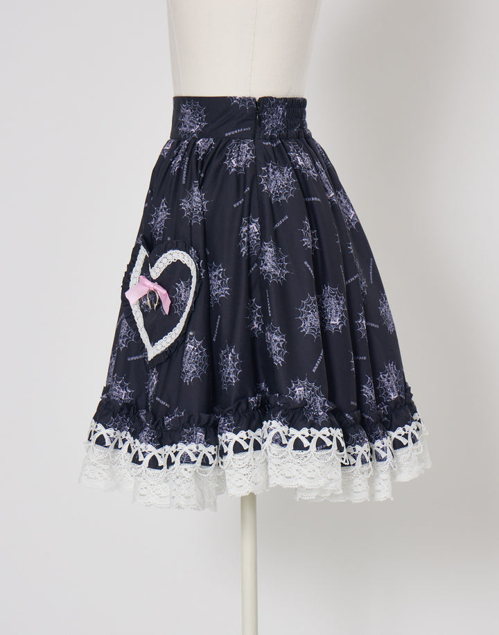 ブランドロゴと蜘蛛の巣のオリジナルプリントスカート。ハート型のポケットにはリボンとアクセントにピアスを付けました。裏地のチュールがボリュームを出してくれるので、歩くたびにふんわり揺れるシルエットが魅力。Skull illustration print cami tops(325580157)とセットアップでの着用が可能です。