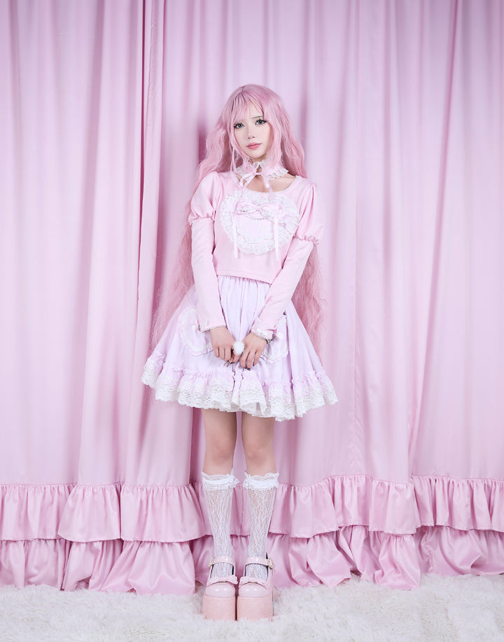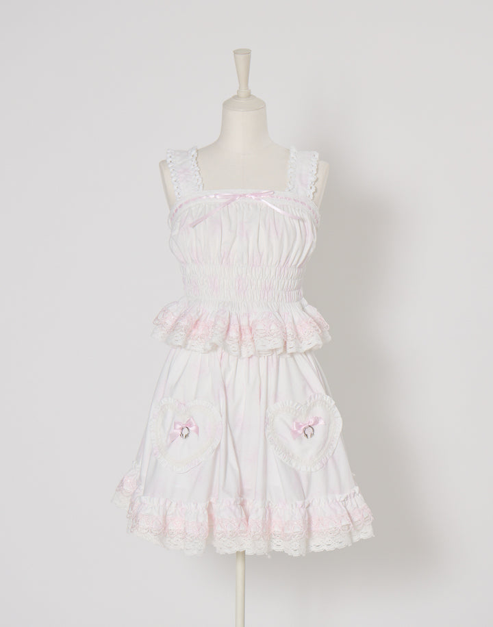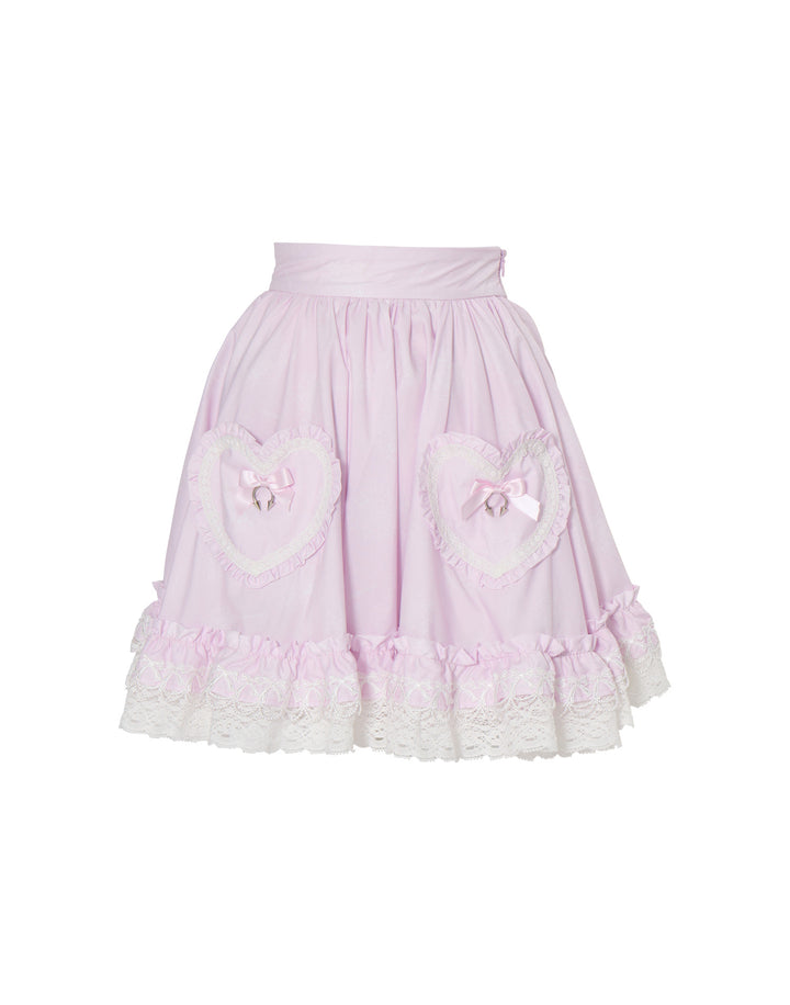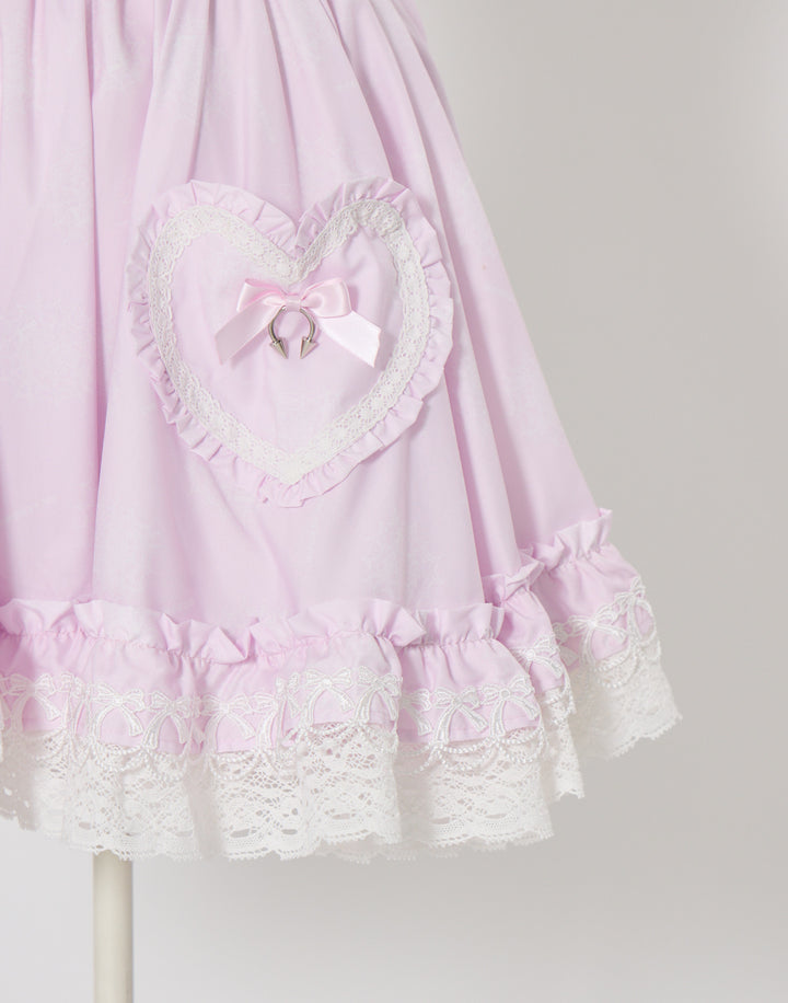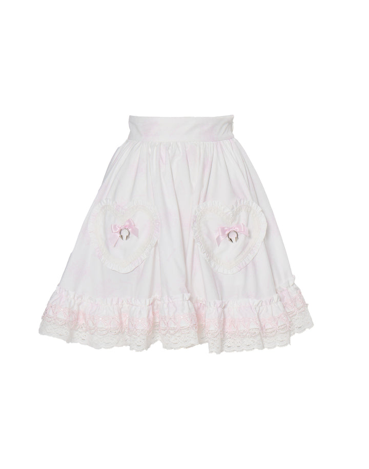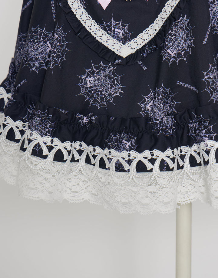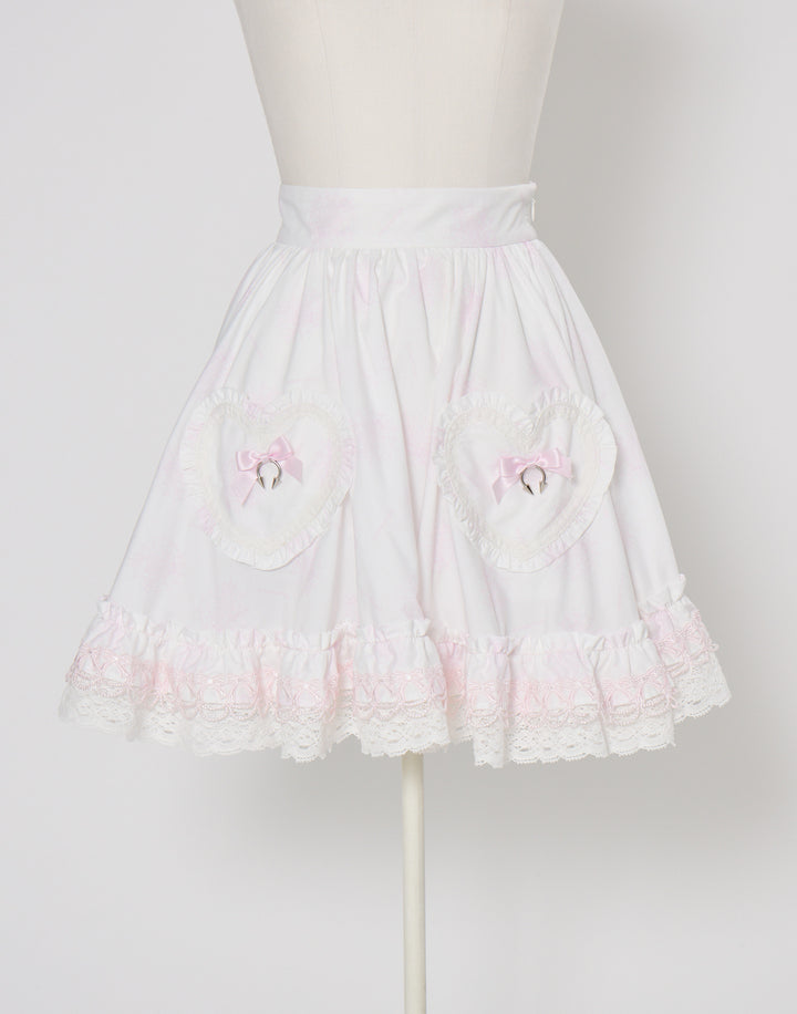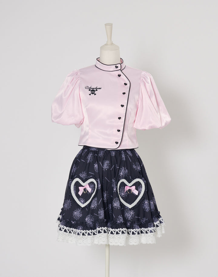 ブランドロゴと蜘蛛の巣のオリジナルプリントスカート。ハート型のポケットにはリボンとアクセントにピアスを付けました。裏地のチュールがボリュームを出してくれるので、歩くたびにふんわり揺れるシルエットが魅力。Skull illustration print cami tops(325580157)とセットアップでの着用が可能です。