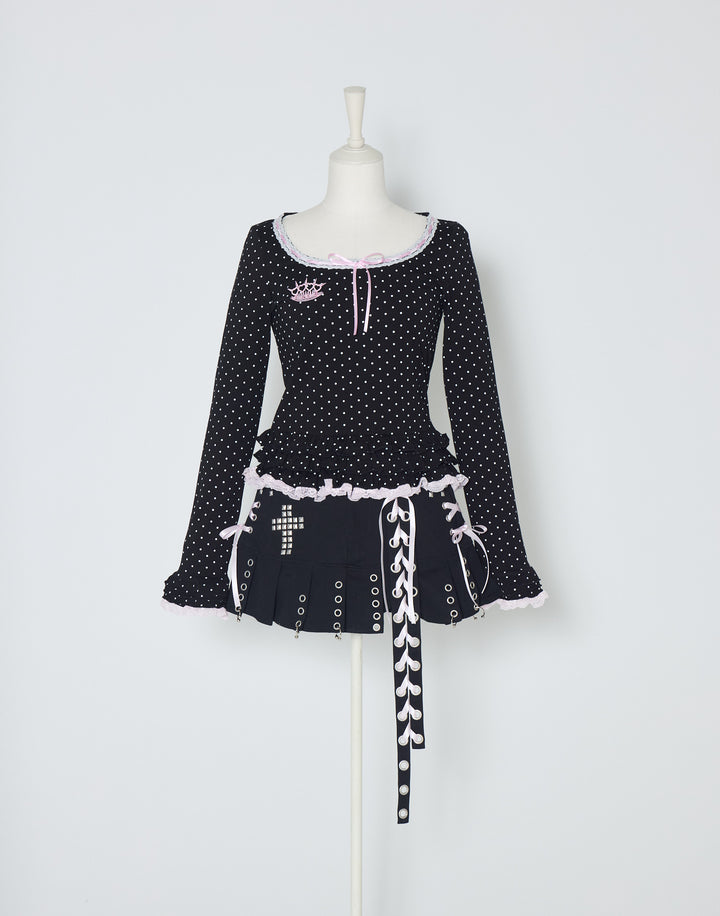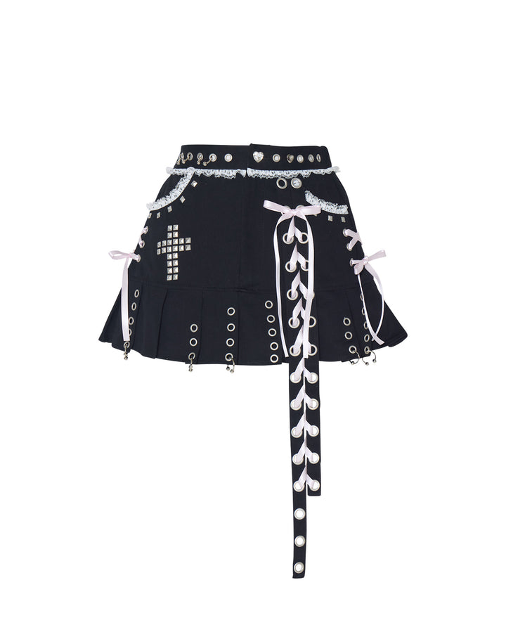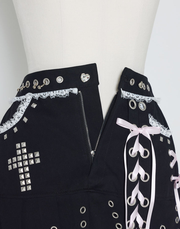 ピアスやスタッズ、ハトメを豊富にあしらったミニスカート。アシンメトリーに配置されたレースアップデザインが目をひきます。