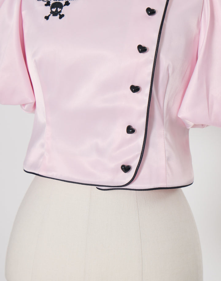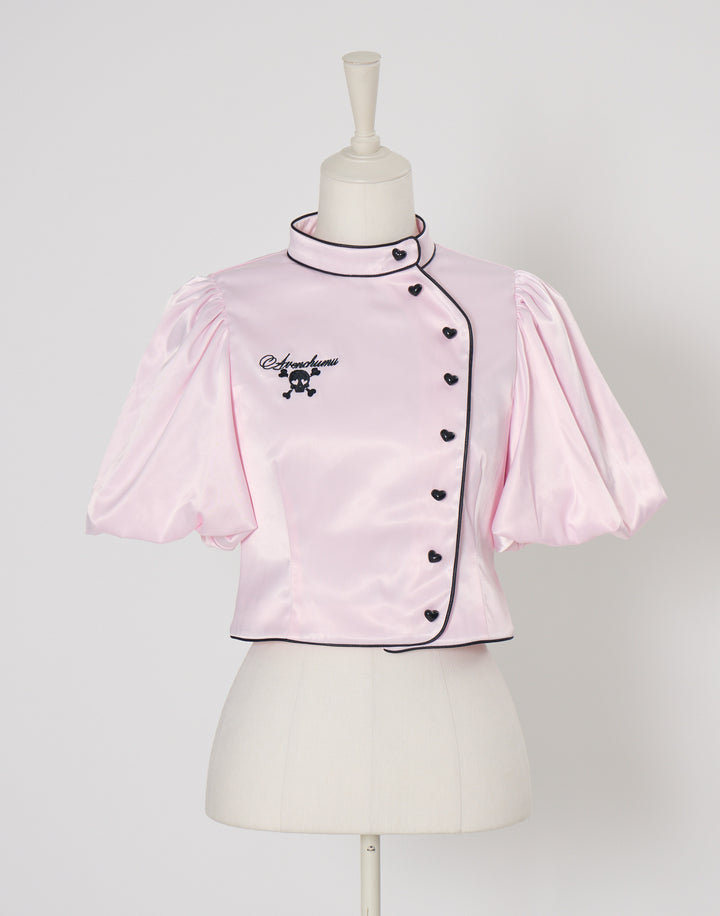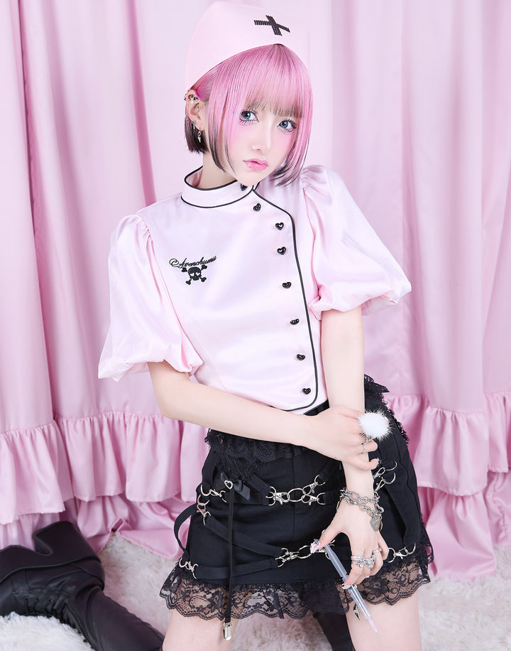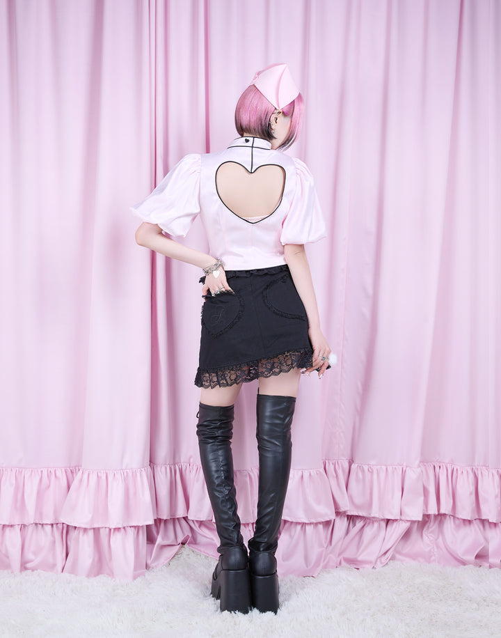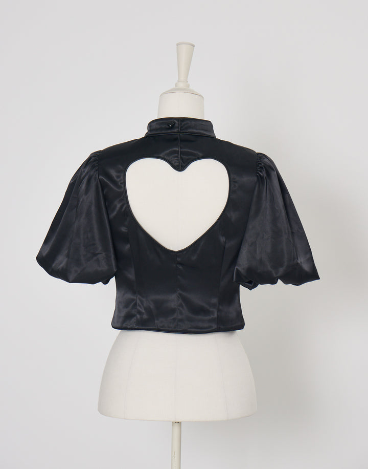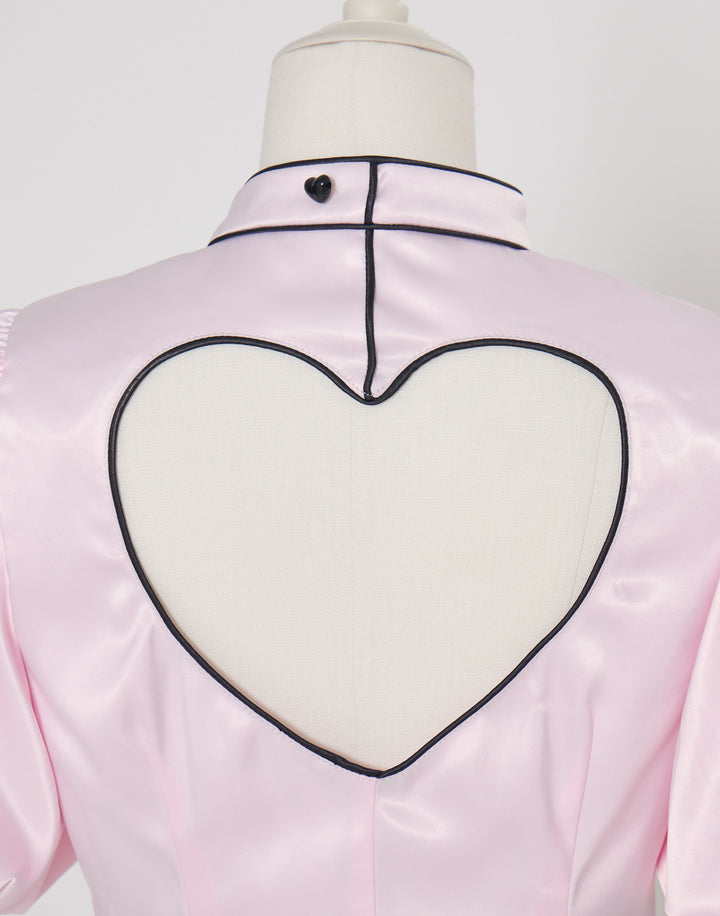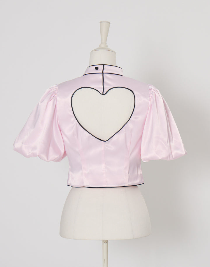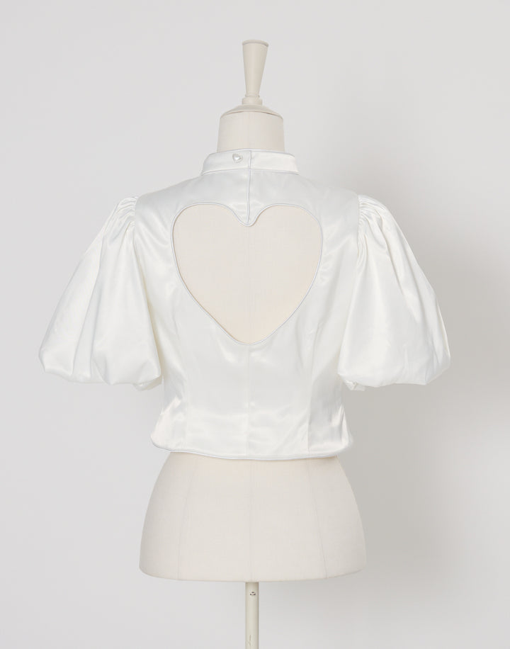 艶めくサテン生地が高級感のあるナースウェア風ブラウス。ボリューミーなバルーンスリーブと、ハート型に大きく開いたバックスタイルが目を引く一枚。ころんとしたハートのボタンがスナップボタンになっているので着脱も簡単です。