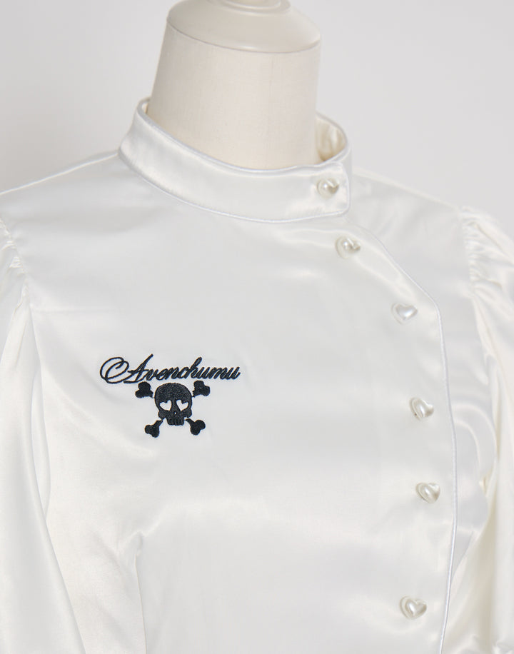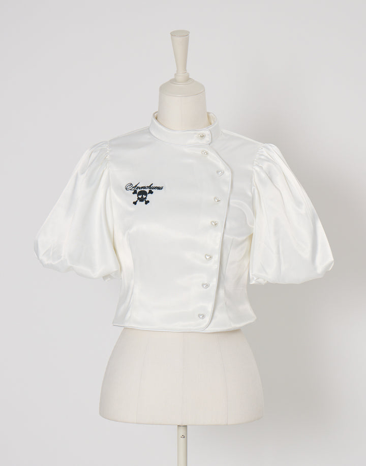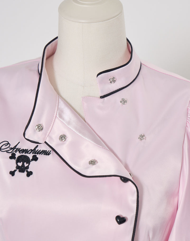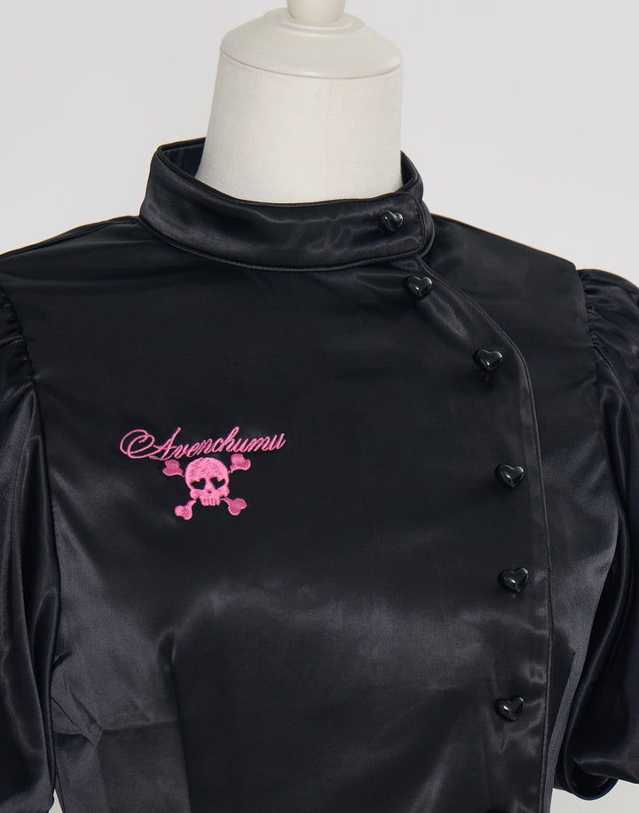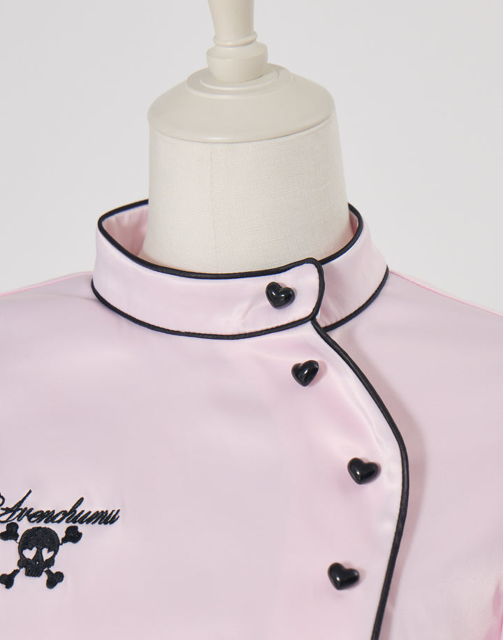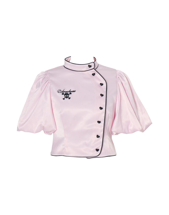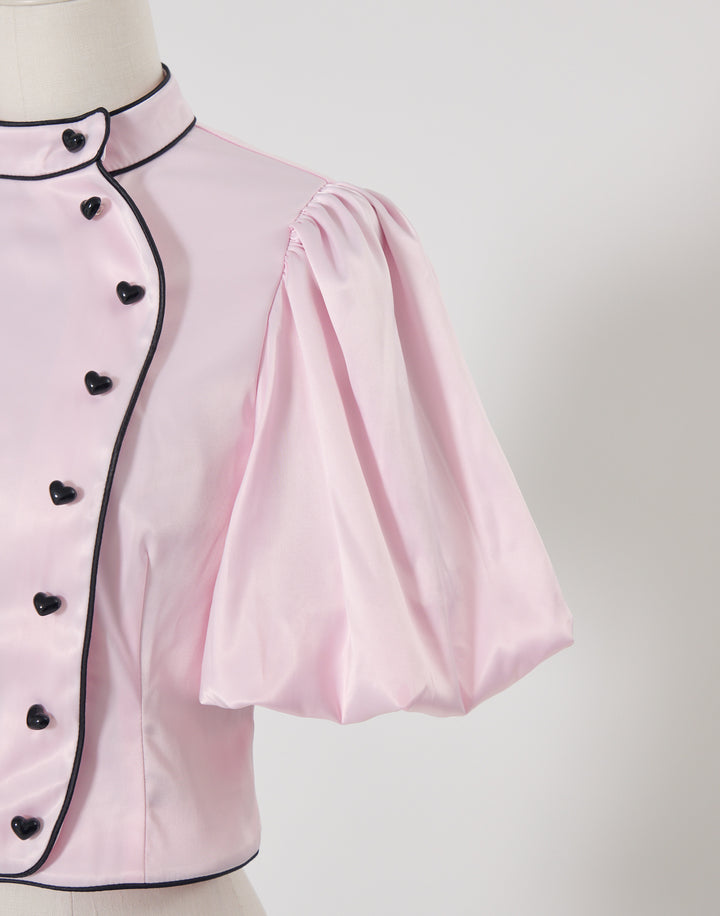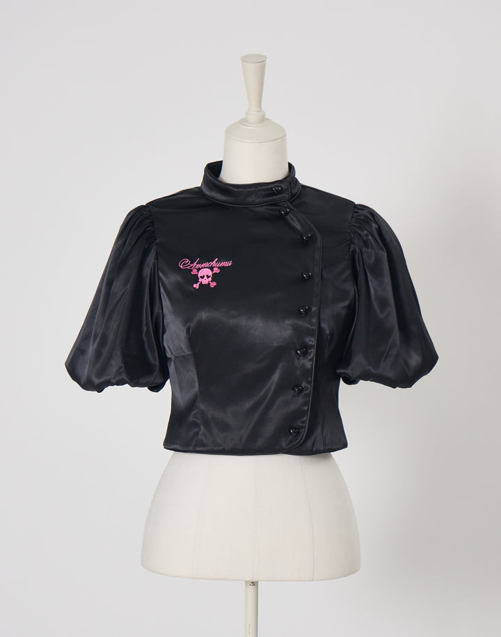 艶めくサテン生地が高級感のあるナースウェア風ブラウス。ボリューミーなバルーンスリーブと、ハート型に大きく開いたバックスタイルが目を引く一枚。ころんとしたハートのボタンがスナップボタンになっているので着脱も簡単です。