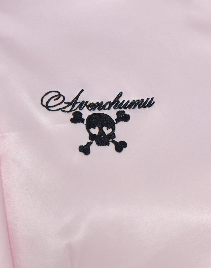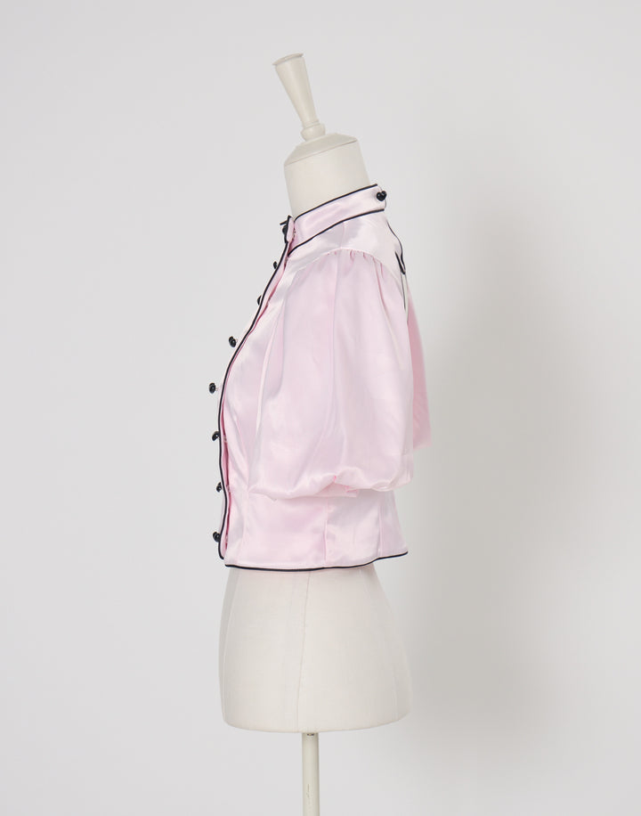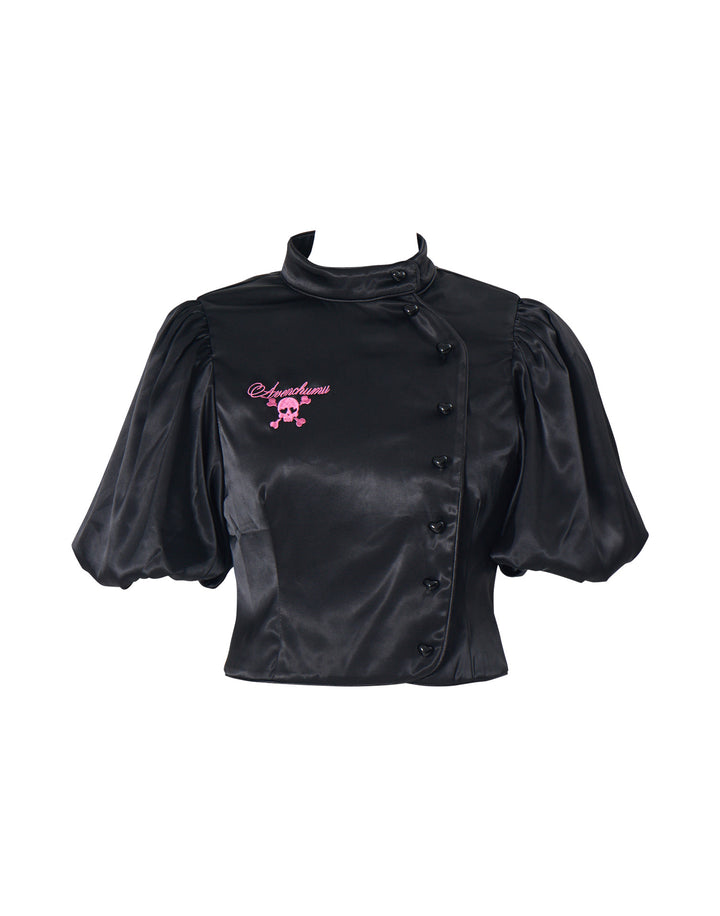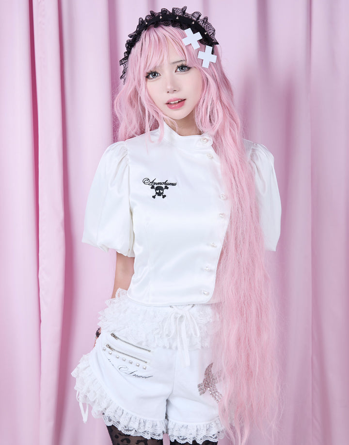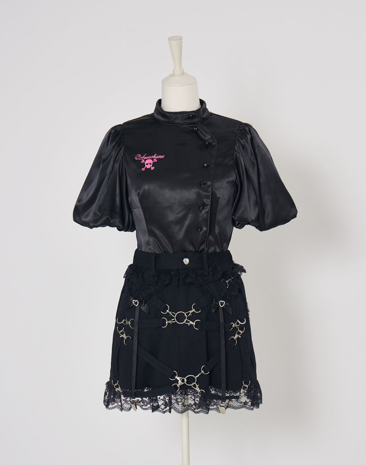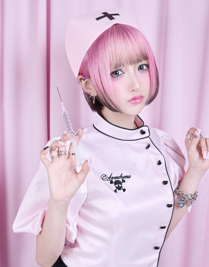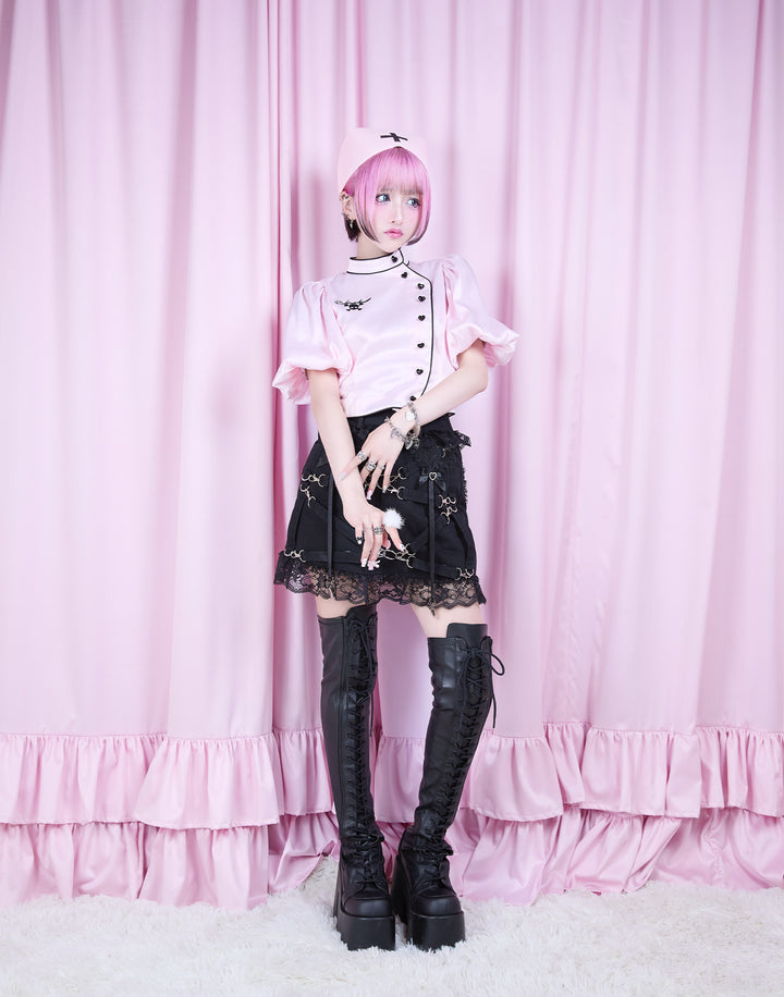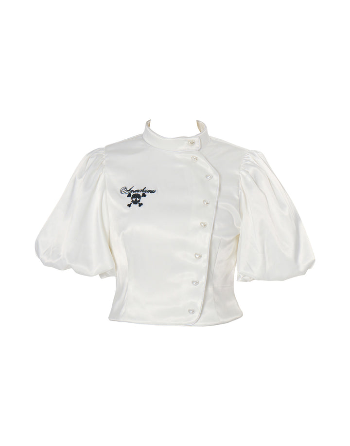 艶めくサテン生地が高級感のあるナースウェア風ブラウス。ボリューミーなバルーンスリーブと、ハート型に大きく開いたバックスタイルが目を引く一枚。ころんとしたハートのボタンがスナップボタンになっているので着脱も簡単です。